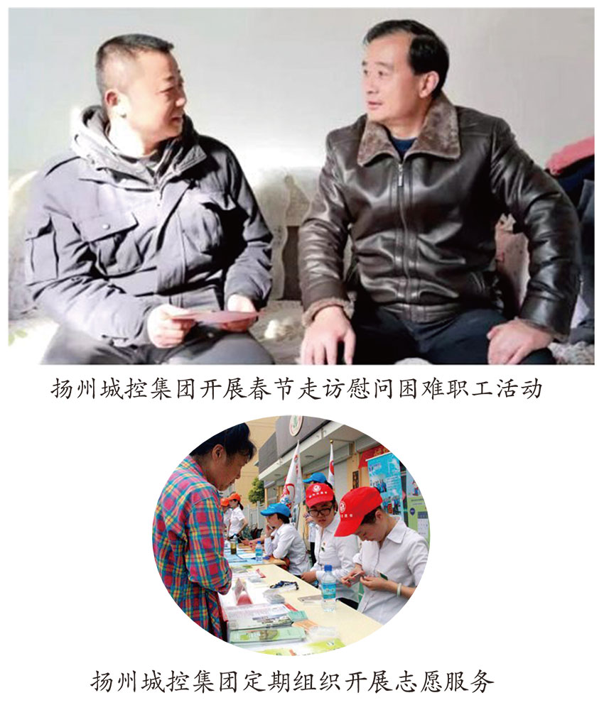 此外,扬州城控集团大力开展扶贫帮困活动,先后投入资金79.4万元,援助经济薄弱村建设标准化厂房、修建“农民公园”,为贫困户发放救济金和生活必需品,还通过供水供气企业为民政部门认定的城乡低保户、农村五保户以及扬州市总工会认定的特困职工家庭减免水费5万多元,减免天然气开户费10.6万元、使用费1.6万元。此外,集团还采取走访慰问的方式,为贫困社区居民和困难职工家庭,送去生活必需品和慰问金7.3万元。