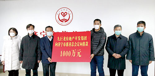 2020年新冠肺炎疫情发生后,九巨龙房地产开发集团克服企业生产经营困难,第一时间通过济宁市慈善总会捐款1000万元,成为济宁全市最大的一笔疫情防控资金捐赠,有力支持了疫情防控工作,再次彰显了企业崇高社会责任和优秀企业家精神与担当。