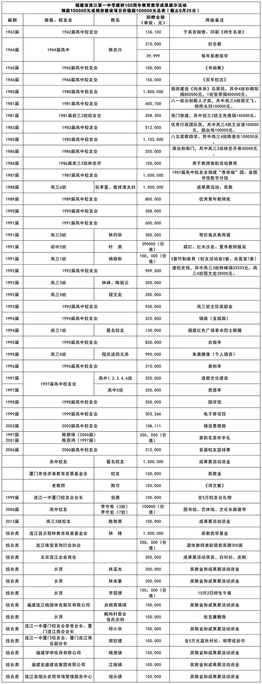 附:连江一中建校100周年教育教学成果展示活动捐赠超过100000元人民币的团体或个人名单: