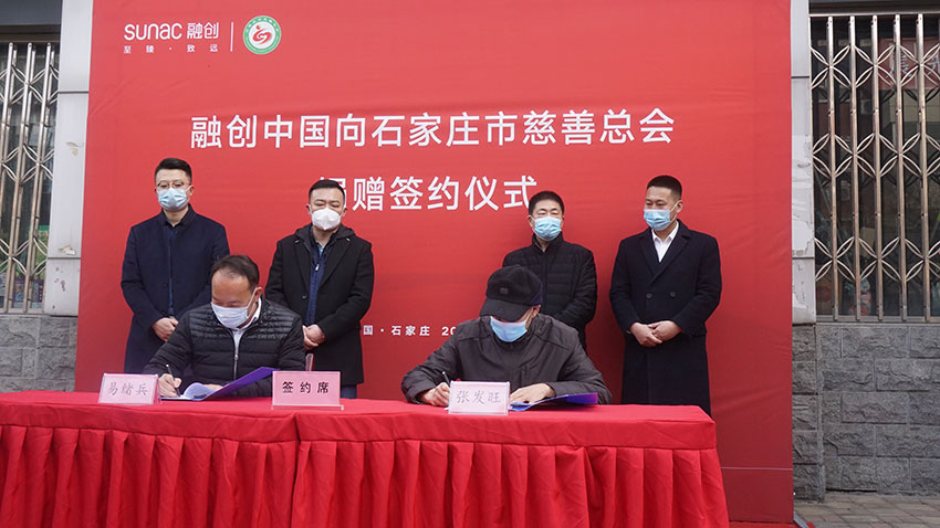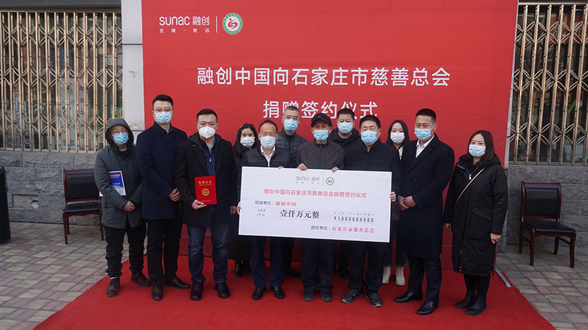 在石家庄市慈善总会门前广场举行的捐赠签约仪式上,市慈善总会会长张发旺进行签约并接受捐款,石家庄市慈善总会常务副会长孟慧贤向融创中国颁发了捐赠证书。市慈善总会副会长兼秘书长杨华、融创北京区域总裁助理兼石家庄公司总经理易绪兵、石家庄市巨邦房地产开发有限公司总经理郑永辉、融创北京区域石家庄公司财务总监高奕、融创北京区域石家庄公司品牌策划总监鲁双出席了仪式,裕华区、长安区、新华区、高新区、藁城区、栾城区的民政部门主管领导参加了捐赠仪式。