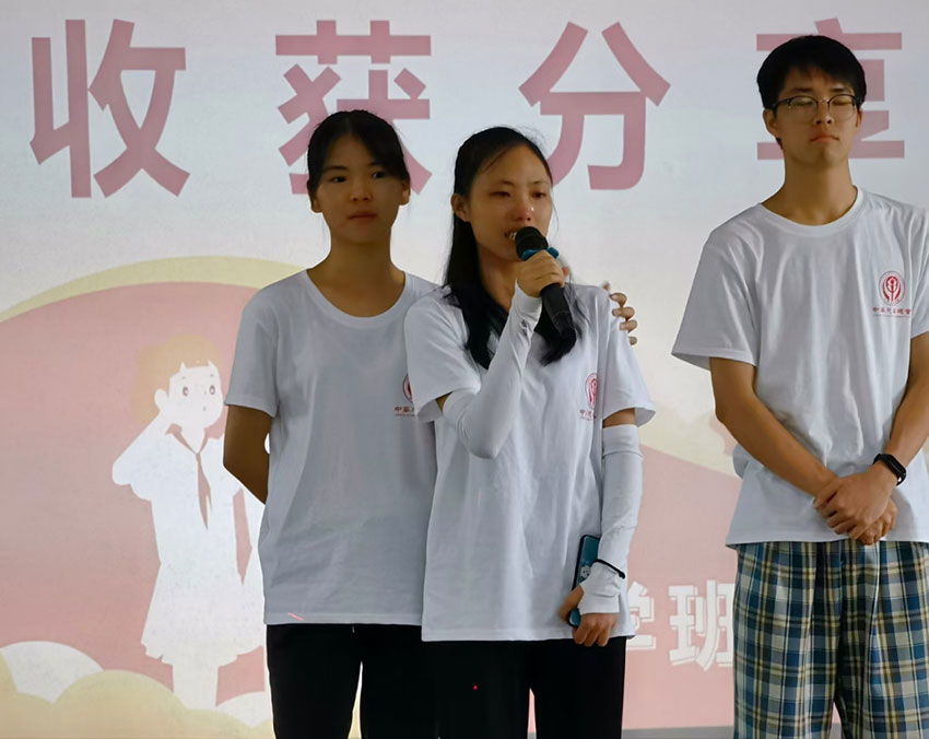 大学生志愿者劳倩在结业仪式上感动地流泪