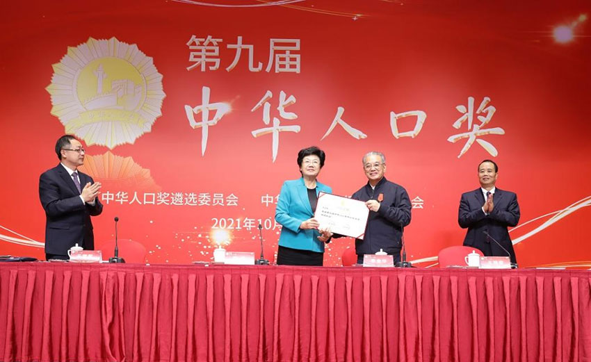 十三届全国政协副主席、秘书长李斌为第九届中华人口奖特别荣誉奖获得者李金华颁奖