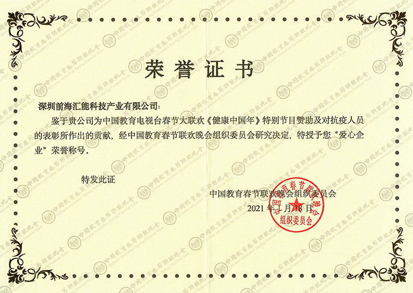 汇能科技因为在2020年抗击新冠肺炎疫情中做出积极贡献,被邀请出席中国教育电视台春节大联欢晚会,并被授予“爱心企业”荣誉称号