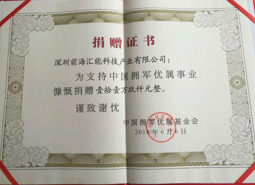 汇能科技不忘初心,积极感恩回馈社会,向中国拥军优属基金会捐款11.9万元奉献爱心