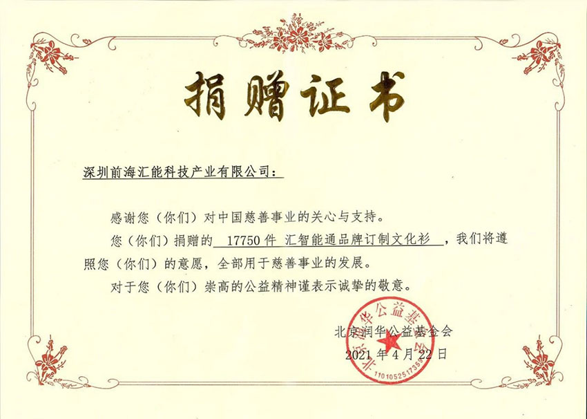2021年4月22日,汇能科技向北京润华公益基金会捐赠17750件定制文化衫