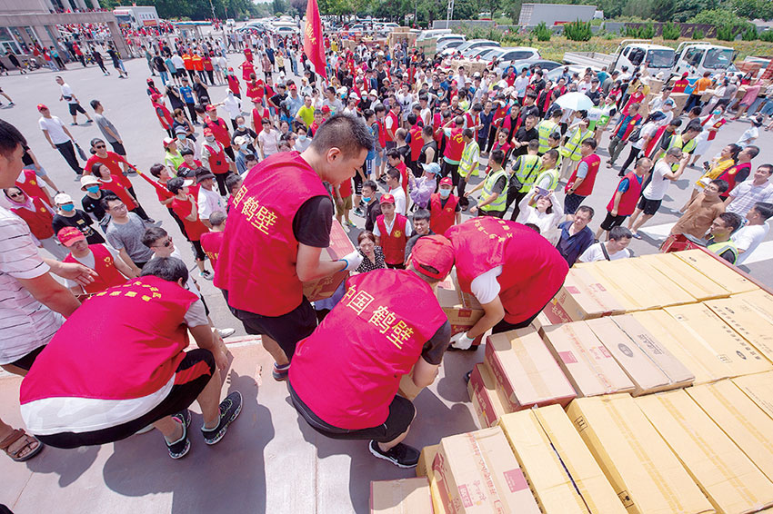 2021年7月25日,鹤壁市抗洪救灾志愿者在物资接收点搬运物资