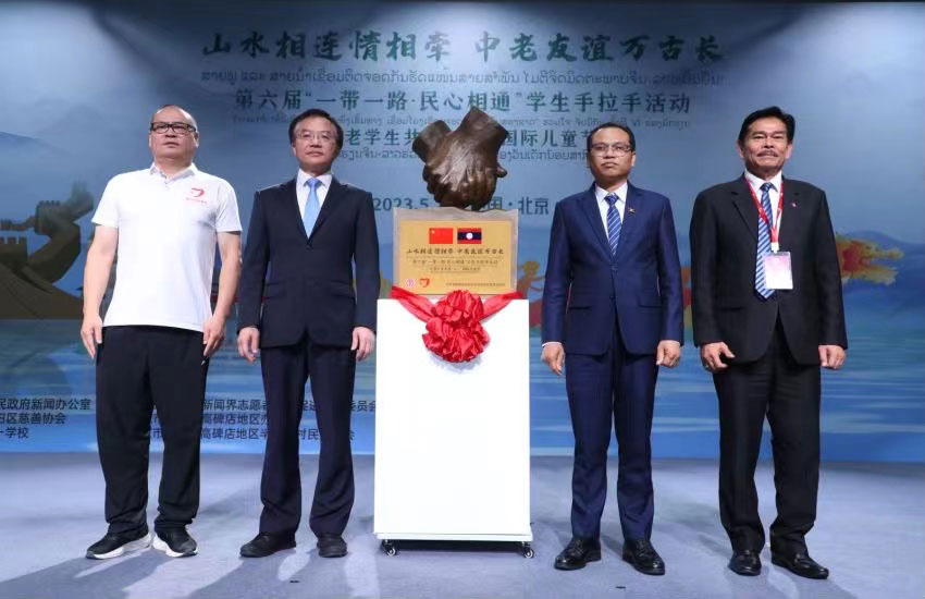 北京市朝阳区区委书记文献、中华慈善总会荣誉副会长徐镱轩、靳达望参赞、老挝教育和体育部高等职业教育司司长赛康·攀塔翁共同为中老友谊雕塑揭幕。