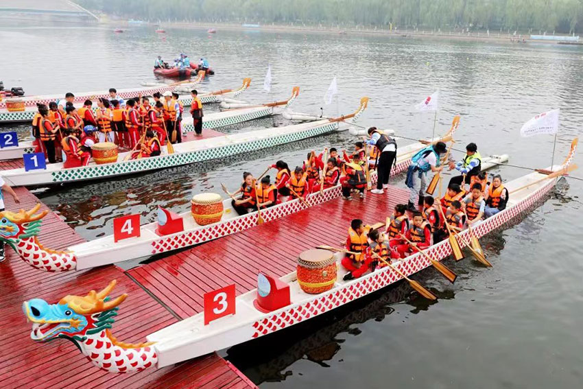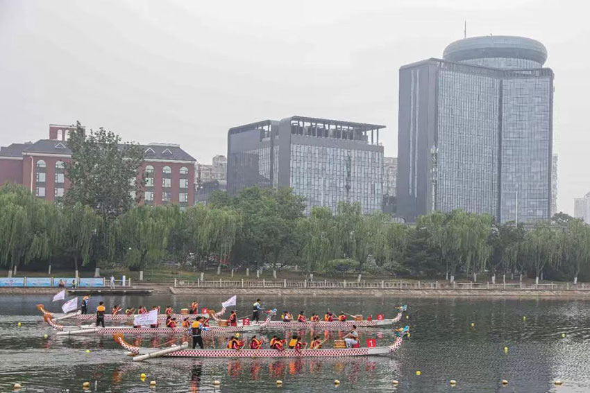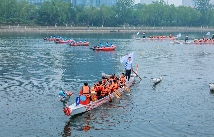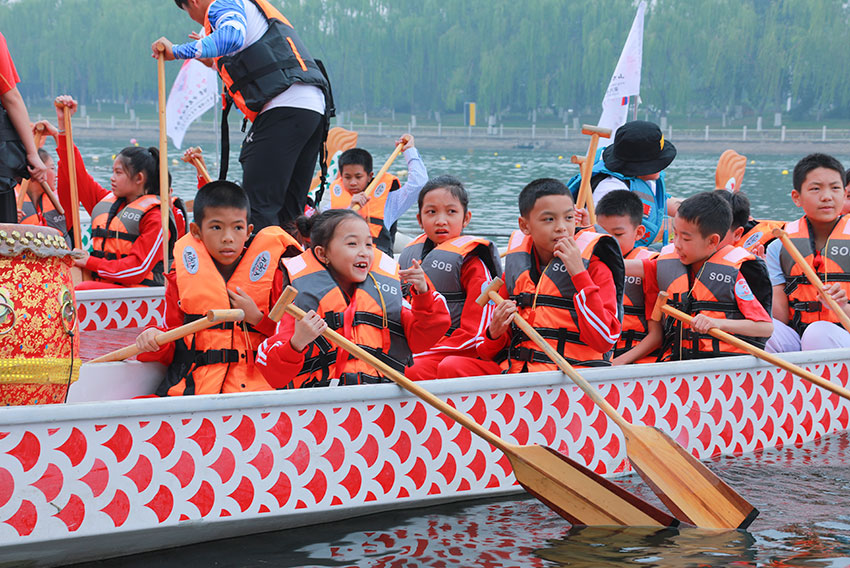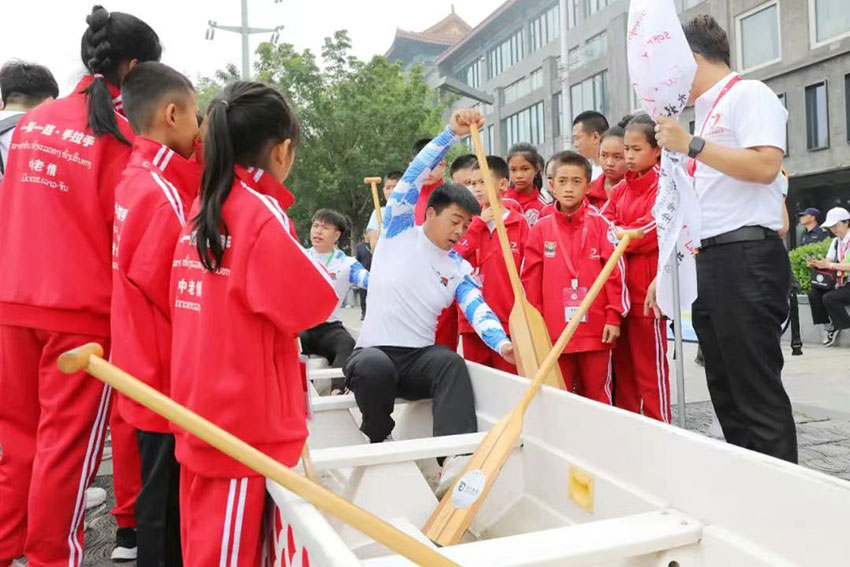 下午,学生们在半壁店村通惠河畔,体验中国传统龙舟文化,共同举行中老两国学生水上龙舟友谊联赛。随着水上龙舟友谊赛发令的哨音,通惠河水面上浪花飞溅、龙旗飘舞,龙舟整齐从起始线启航,中老同学们逐浪通惠河,尽显中老学生携手奋进的友谊。
