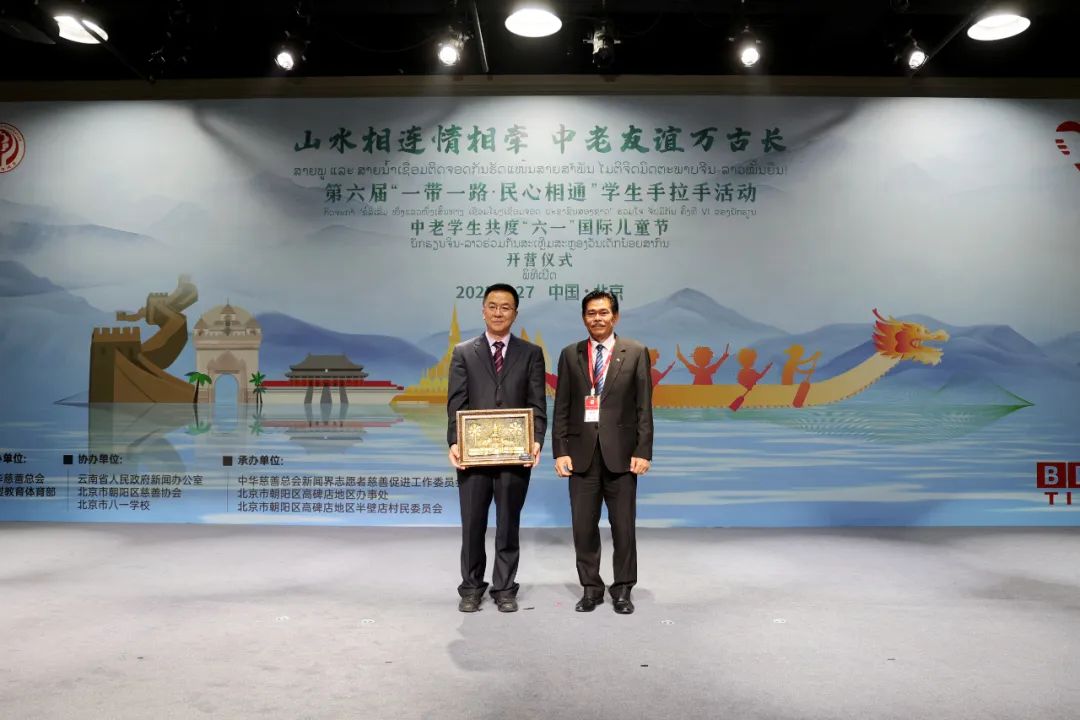 北京市朝阳区慈善协会会长陈涛向老挝学生代表赠送定制邮票和友谊瓷盘纪念品。高碑店乡党委书记顾洪涛向中方学生代表赠送定制邮票和友谊瓷盘纪念品。