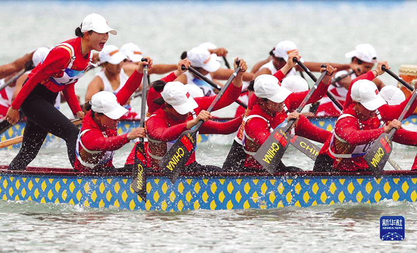 10月6日,在浙江温州龙舟运动中心进行的杭州亚运会女子组12人龙舟1000米直道竞速赛中,中国队以4分51秒448的成绩获得冠军。印度尼西亚队获得亚军,韩国队获得季军。图为中国队选手在决赛中。孟晨光 摄