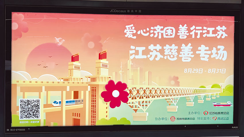 为了引领崇德向善风尚,苏州市慈善总会(基金会)开展了多渠道、多层面、多形式的“中华慈善日”主题宣传活动,在全市掀起全民慈善热潮。在《苏州日报》推出慈善专版,介绍项目情况,让市民可以直接扫描项目捐赠二维码,献出一份爱心;在电视、轨道交通、公交车移动电视上播放慈善宣传片和江苏慈善专场宣传海报。在户外显示屏播放慈善公益宣传图片;在苏州地标建筑东方之门投放宣传标语,通过航拍、制作短视频,传播慈善文化,发动群众广泛参与慈善,营造“人人可慈善、处处可慈善”的浓厚氛围。
