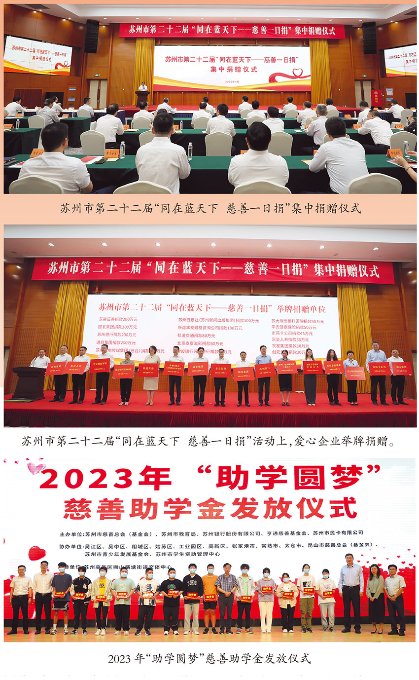 自2002年以来,苏州市每年举办“同在蓝天下——慈善一日捐”活动,至今已连续开展22年。在这场全市性的爱心捐助活动中,市领导带头捐赠,广大机关、企事业单位和社会各界爱心人士积极响应,成为苏州参与面最广、影响力最大、知名度最高的慈善公益品牌。