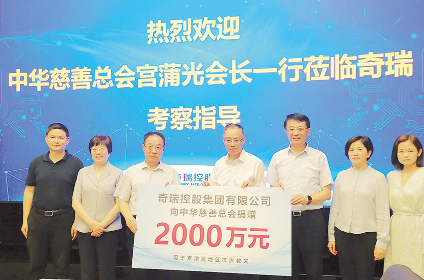 8月16日,中华慈善总会会长宫蒲光亲赴位于安徽省芜湖市的奇瑞控股集团有限公司(以下简称奇瑞集团),给他们送去感谢信和捐赠证书,对他们为抗击强降雨灾害而进行的爱心捐赠表示感谢。