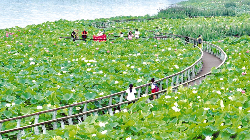 盛夏时节,各地荷花竞相开放,美不胜收。7月1日,游客在四川省遂宁市圣莲岛上赏荷游玩。刘昌松 摄