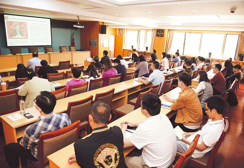 中华慈善总会全体人员在总会大会议室收听收看了报告会。 李济慈 摄