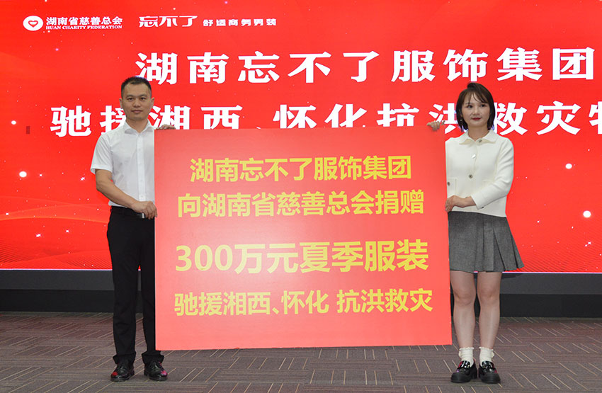 善公益报(本报记者 叶清 通讯员 范拥科)6月13日,湖南忘不了服饰集团向湖南省慈善总会捐赠1.67万件服装,支援湘西怀化防汛救灾。 一方有难,八方支援。湖南忘不了服饰集团积极响应湖南省慈善总会的倡议,集团高层看到倡议后迅速研究支援举措,组织员工清点打包1.67万件价值300万元的夏季服装,支援灾区,给受灾群众送去温暖,用爱心点燃希望。