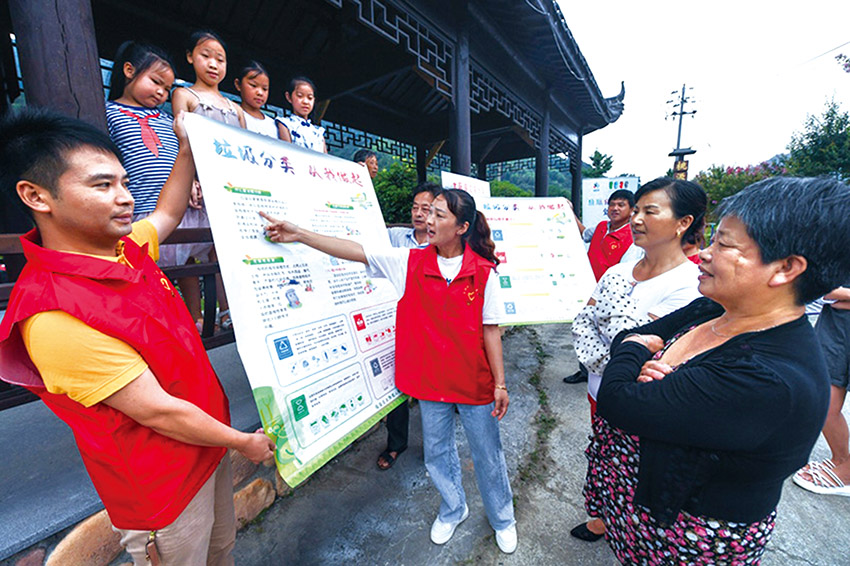 近日,浙江省杭州市临安区太阳镇基层党员志愿者组建起“乡村流动课堂”,活跃在太阳镇的各个村落,普及垃圾分类知识。图为党员志愿者在太阳镇桃源溪村开展活动。徐 昱 摄