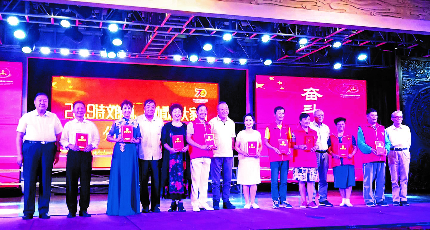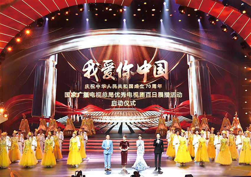 8月25日,为庆祝中华人民共和国成立70周年,国家广播电视总局“优秀电视剧百日展播”在青岛西海岸新区启动。图为主持人在启动仪式上介绍推荐的剧目。