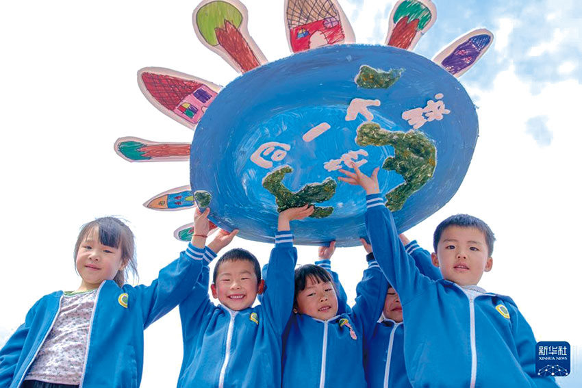 4月22日,是世界地球日,各地开展形式多样的主题活动,倡导人们保护环境,珍爱地球。图为浙江省湖州市长兴县水口乡中心幼儿园小朋友用手托起他们绘制的心目中的&ldquo