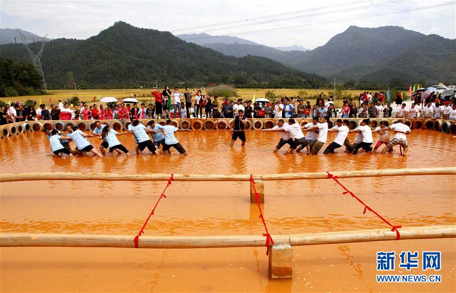 9月20日,村民们在黄泥浆里进行拔河比赛。 当日,一场以“金秋乡村美如画,丰收田野比高下”为主题的农民运动会在江西省靖安县高湖镇古楠村举行。来自全