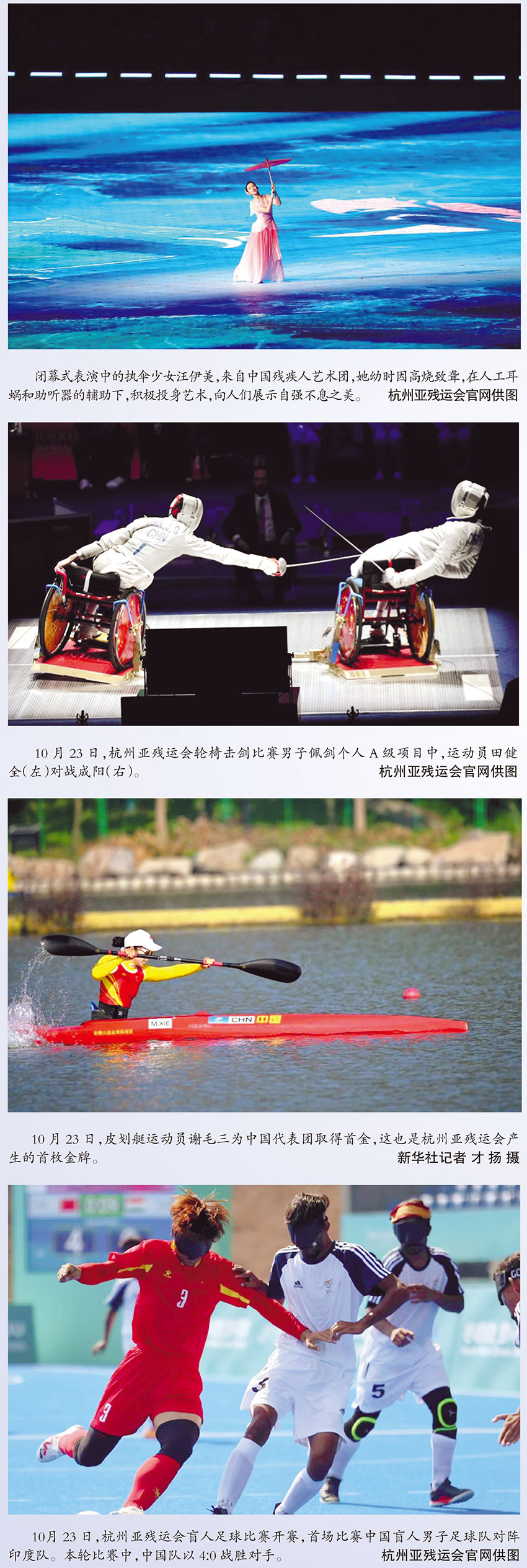 本届亚残运会共产生502枚金牌,共打破世界纪录21次、亚洲纪录72次、亚残运会纪录283次。在这场为期一周的盛大赛事中,残疾运动员挥洒汗水、展现风采,用精彩表现生动诠释了“两个亚运,同样精彩”的真谛;赛事筹办以人为本,无障碍环境水平全面提升,关爱残疾人成为文明风尚,彰显有爱无“碍”;赛场内外,残健融合携手并进,残疾人获得感、幸福感、安全感显著增强,折射出我国残疾人事业发展巨大成就。