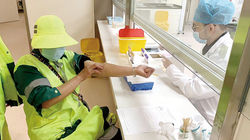 环卫工人在进行体检抽血项目检查
