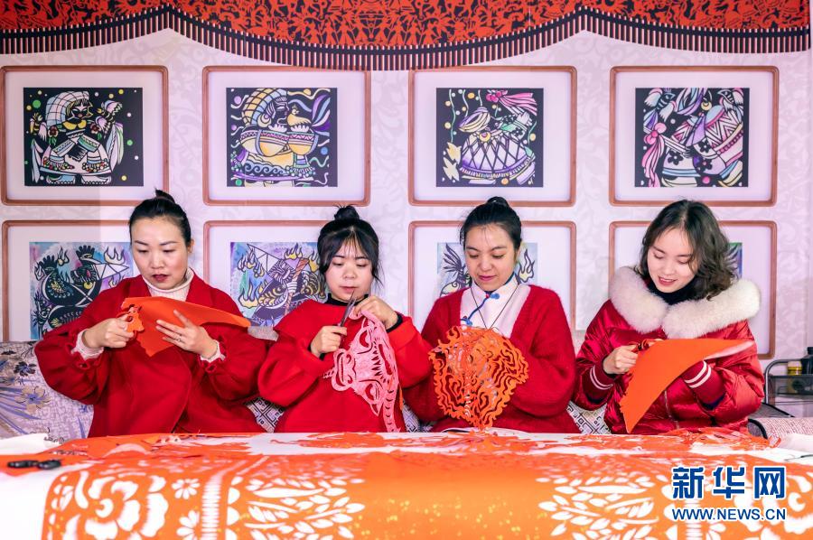 1月17日,岳红霞(右二)带领工作室学员创作“金牛送福”剪纸。近日,曾获全国剪纸大赛“金剪刀奖”、贵州省毕节市黔西县非遗传承人岳红霞带领工作室学员创作“金牛送福”系列主题作品,迎接农历牛年。新华社发(范晖 摄)